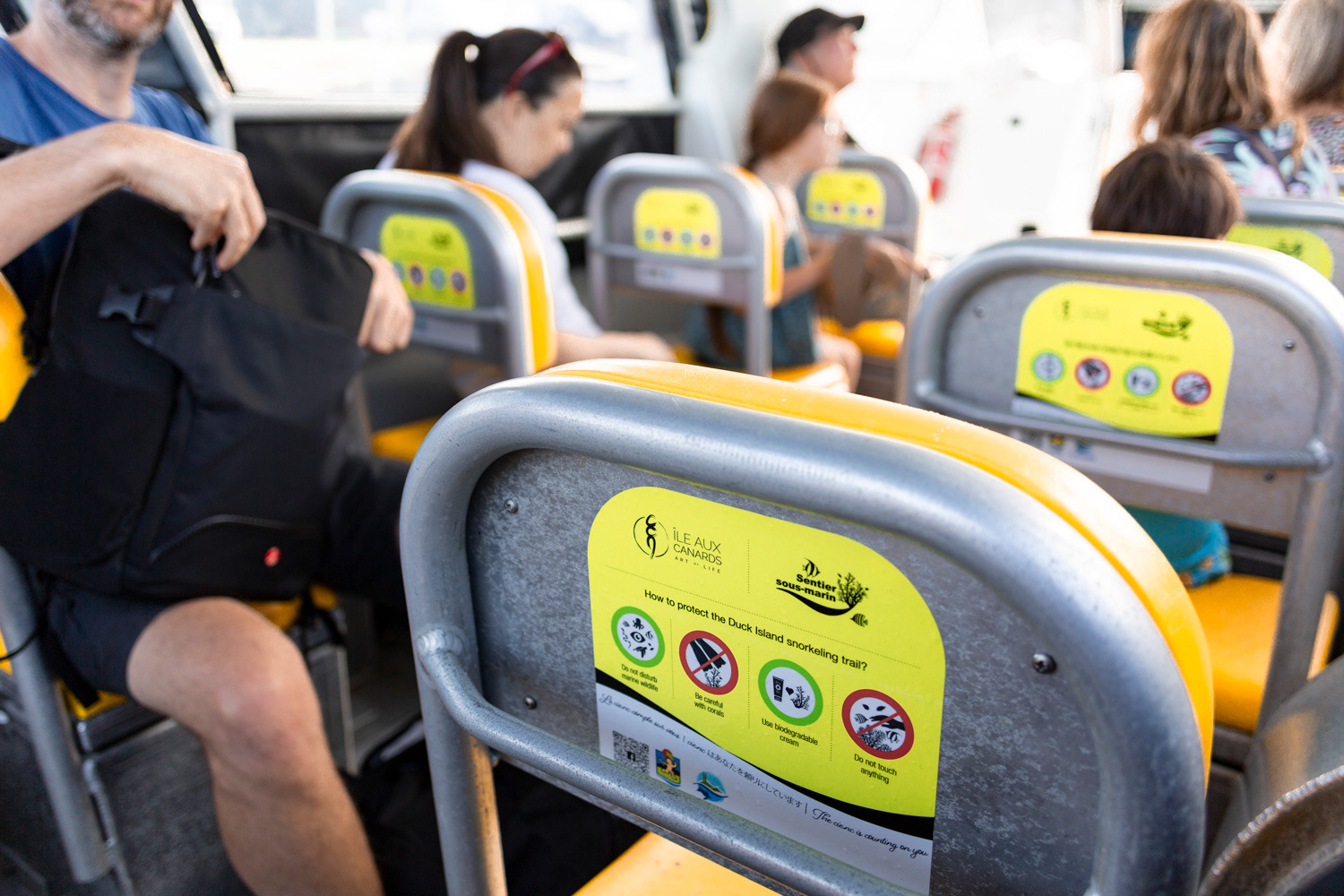 The location and communication tools were chosen in line with the different phases in visitors' trips. Special attention was paid to times when they were waiting or traveling (ticket line, boat crossing, snorkeling equipment rental, etc.).
